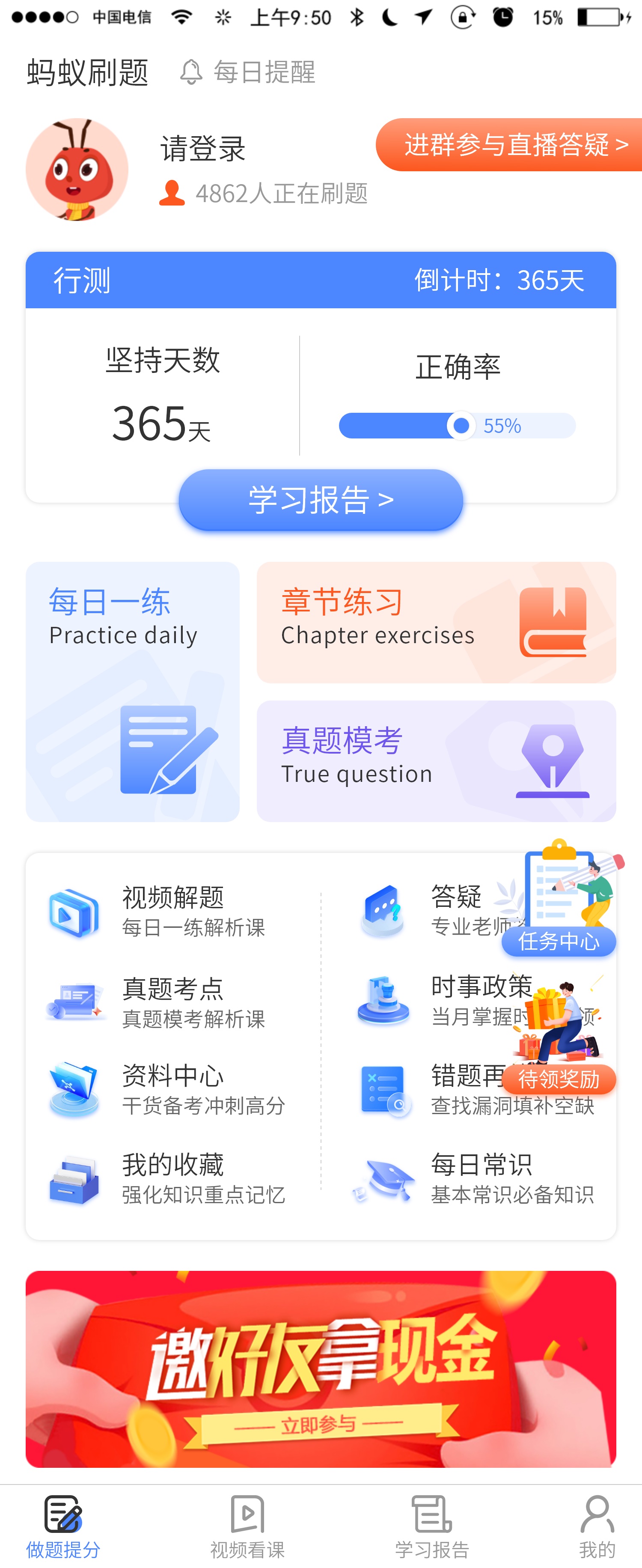 刷题小程序 多种刷题模式:每日一练、章节练习、真题模考、视频解析、错题再练;营销功能:天天领现金、抽奖;会员中心、会员特权、免费资料下载、考试动态