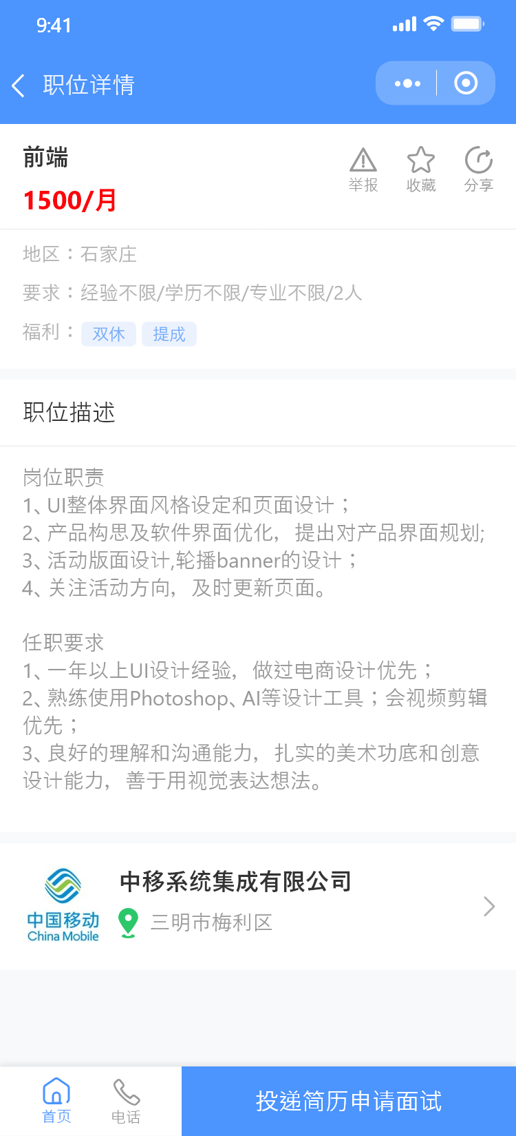 登录 注册 发布招聘信息 企业入驻 信息详情 职位筛选 职位信息编辑 筛选 收藏 举报 分享 拨打电话 获取地址 求职列表 通知 面试 上传图片 编辑信息 简历发布 状态显示