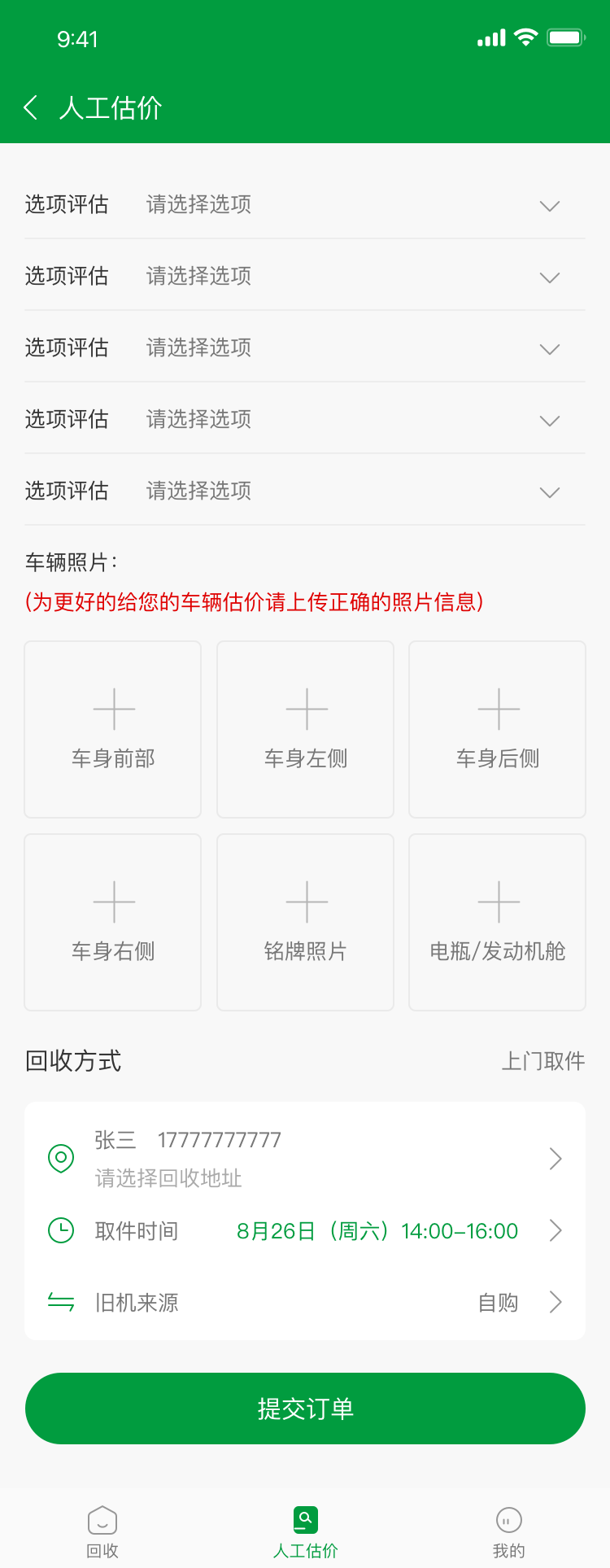 前端:用户登陆后进行估价。有一下两种方式第一种通过平台自动估价;用户通过选择自己车辆的情况选择完。小程序会出现一个价格;如果感觉合适的话提交到后台回收第二种通过人工估价:填写一个表单也就是使用时间、故障、拍照的方式提交到后台;后台人员填写价格;合适的话可以提交订单后台:常见的用户管理、轮播图管理以下