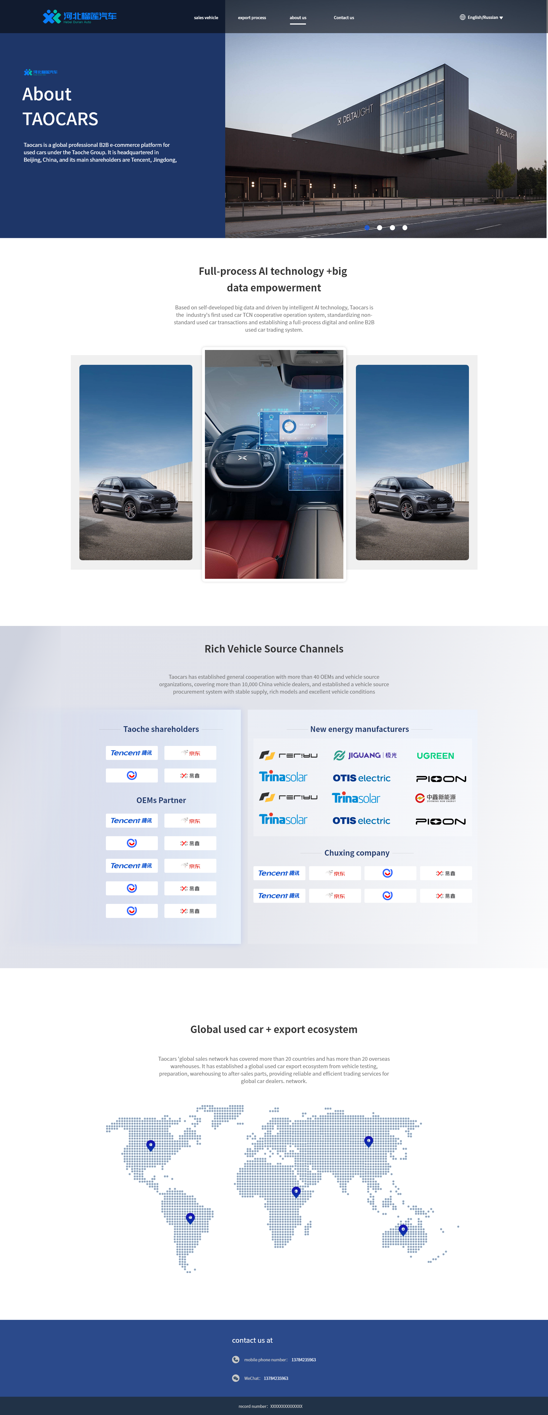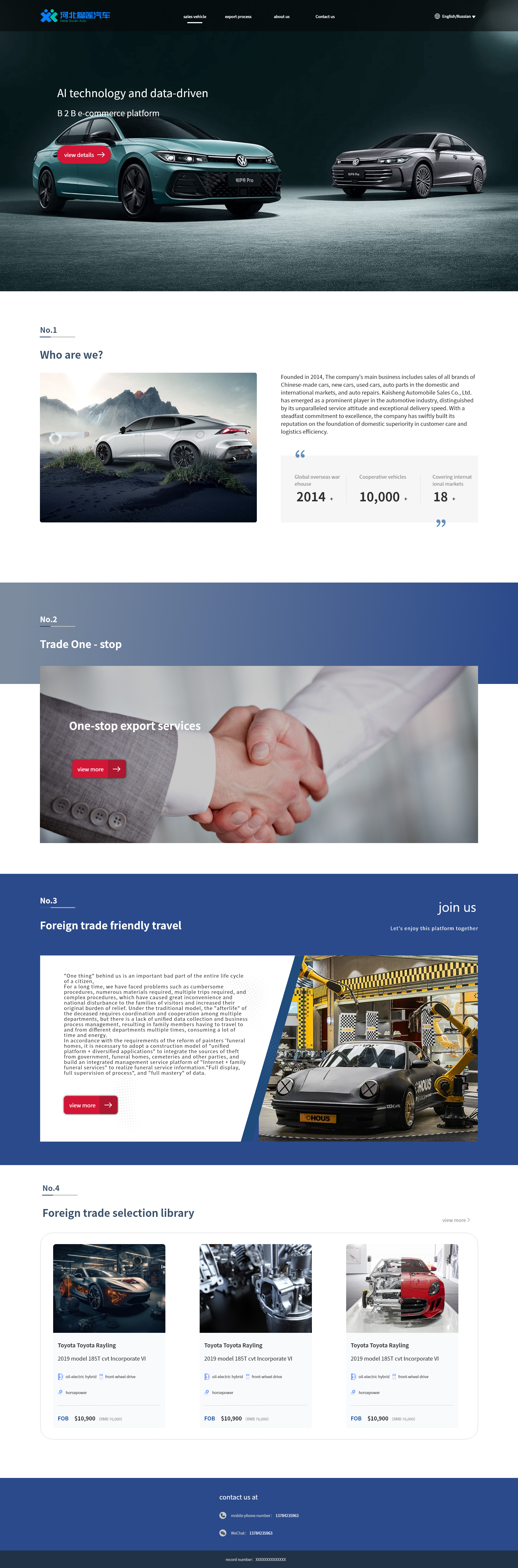 这是一个企业官网,外贸网站,留资名片,线下交易。响应式支持双端查看,双语切换多场景多地区运行,主营类目是汽车。二手车,新车,各大品牌的汽车基本都有