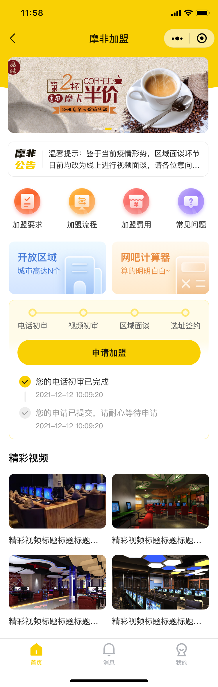 这是一款专注于网吧品牌加盟的服务对接平台,整合加盟全流程信息展示、申请办理、进度跟踪等功能,为意向加盟商提供一站式加盟服务,同时助力品牌方规范加盟流程、高效对接加盟商。核心功能 加盟信息展示:发布后台公告并播报;详细介绍加盟要求、操作流程、费用明细;解答加盟及后续运营中的常见问题;展示已开放加盟的