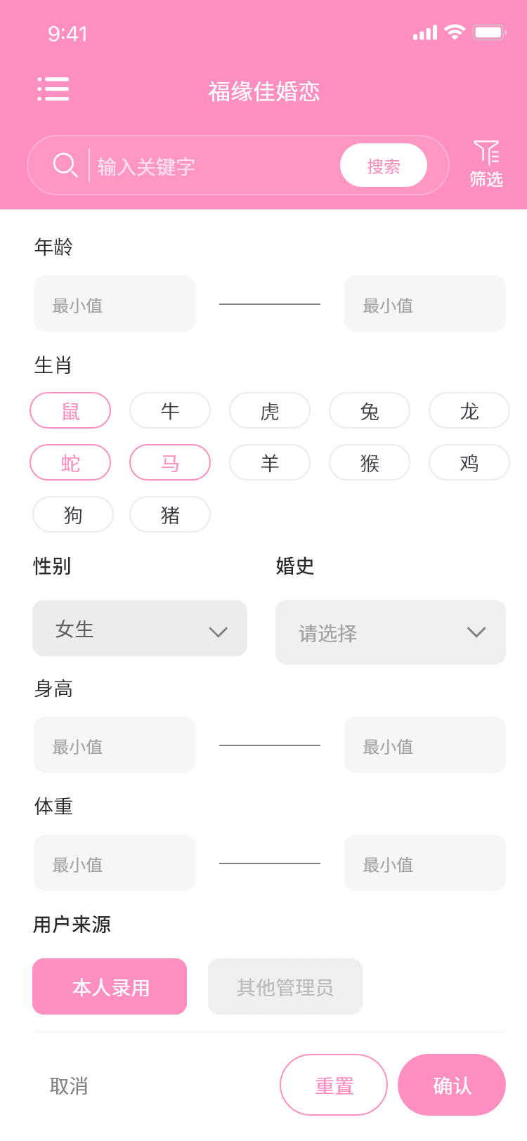 婚恋客户信息小程序 用户端 登录 管理员账号密码登录 首页 新增用户 录入用户个人信息 用户列表 搜索 筛选 管理员自己录入的数据可以查看手机号 非本管理员录入的数据无法查看手机号 想要查看需要联系录入此用户的信息的管理员 PC电脑后台 用户管