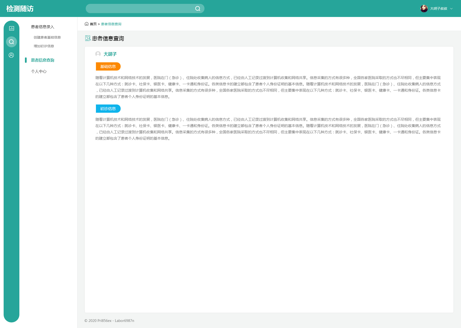 板块功能信息录入信息查询个人统计信息更新录入病人基础信息,创建病人表单搜索查询信息,并可对信息进行修改统计个人录入信息内容数量添加病人信息跟进,通知回访医院管理信息管理医院科室,医生等管理所有信息记录,导出