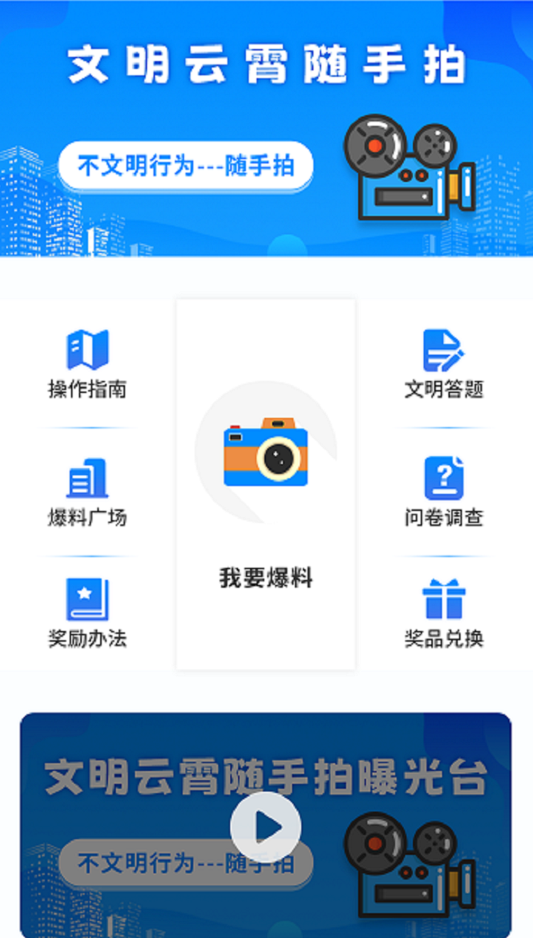 # 文明城市我来拍!这个神器太好用 文明随手拍上线啦!微信一键登录超方便✅ 首页就能爆料,选类型填标题传图/视频,匿名投诉超贴心~ 爆料广场按区县、时间、类别筛选,热度排行榜一眼看清,还能查处理进度! 看操作指引秒上手,参与文明答题赚积分,积分直接兑奖品🎁 还有视频展示、文明宣传动画,
