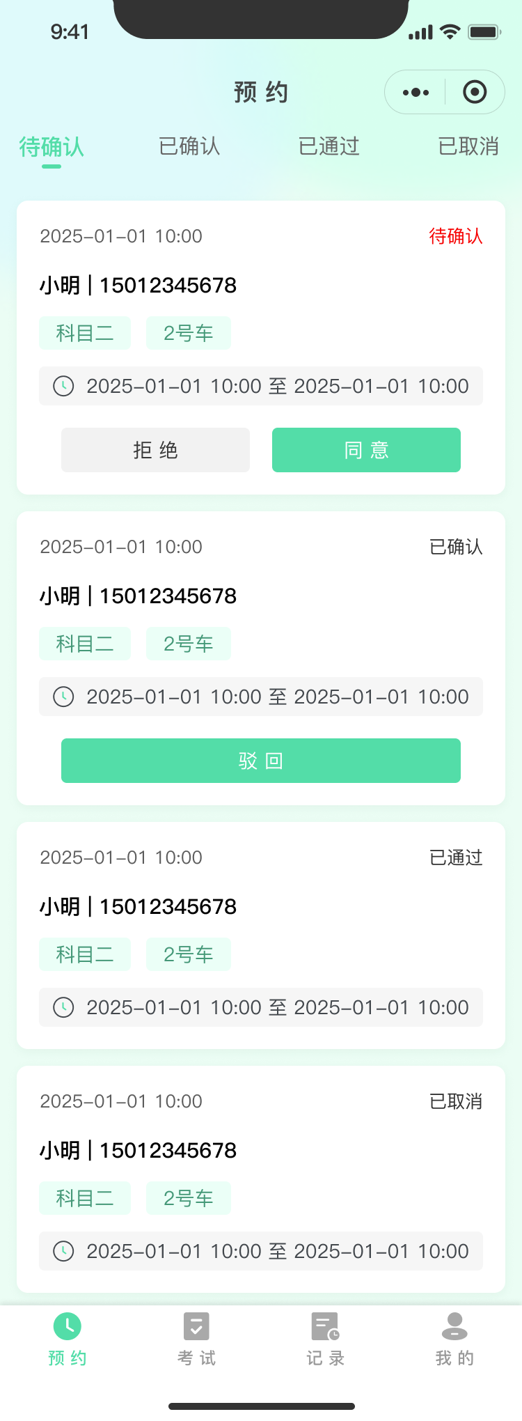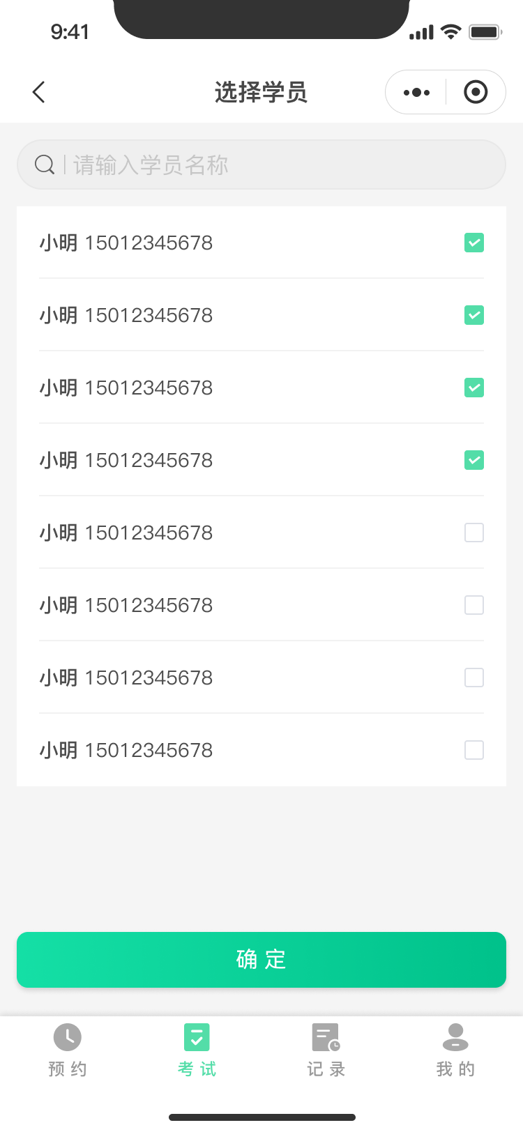 1、学员管理添加(姓名、电话、年龄、性别、身份证号)、编辑、删除、筛选,添加学员选择介绍人(员工中选择)、分配教练(后期调整需要自定义考试通过费用)字段:姓名、电话、年龄、性别、身份证号、科目二课时、科目三课时、科目完成情况(科目二、科目三)、教练、状态(使用中、未使用)、创建时间、操作、重置密码2