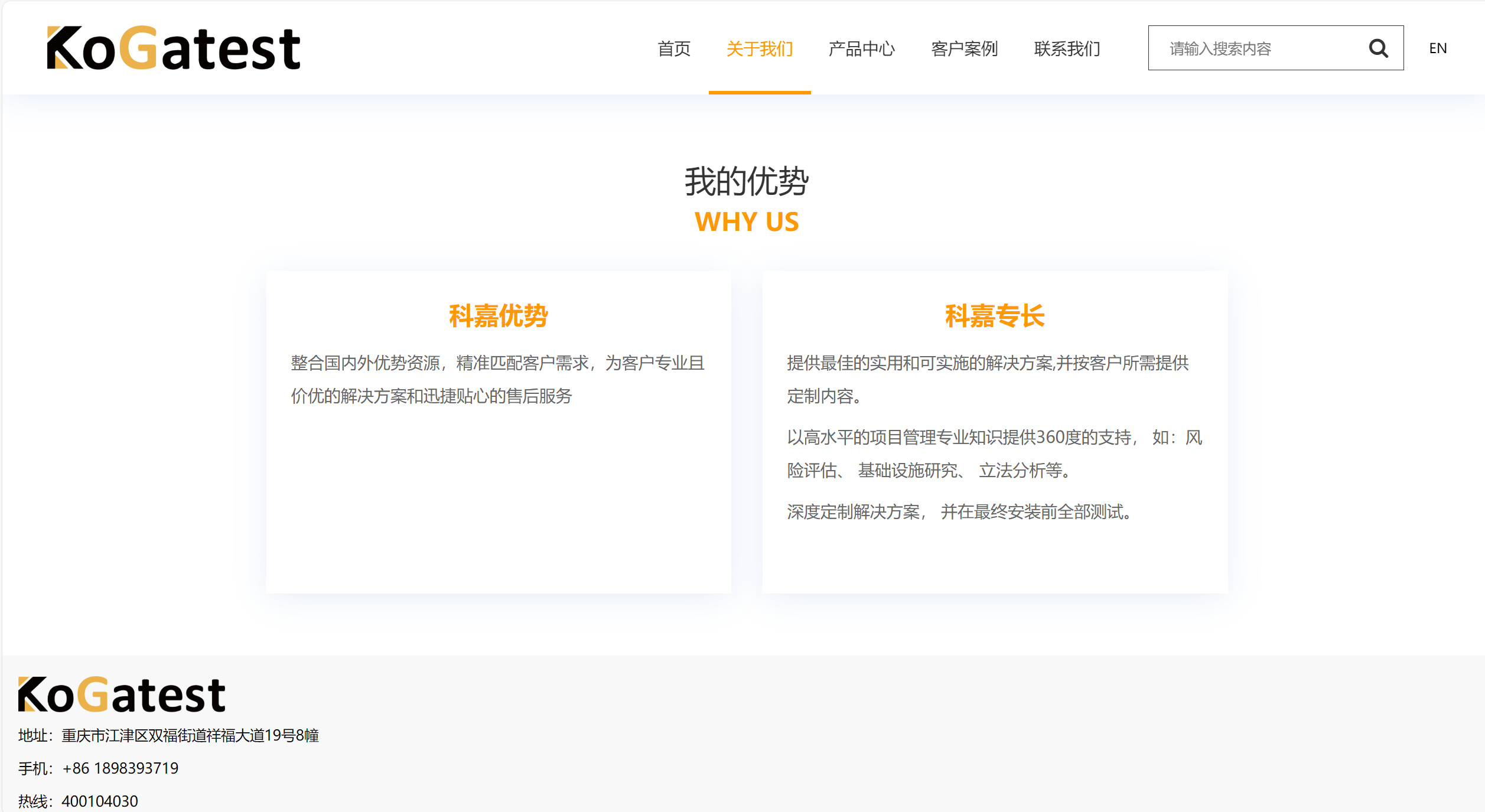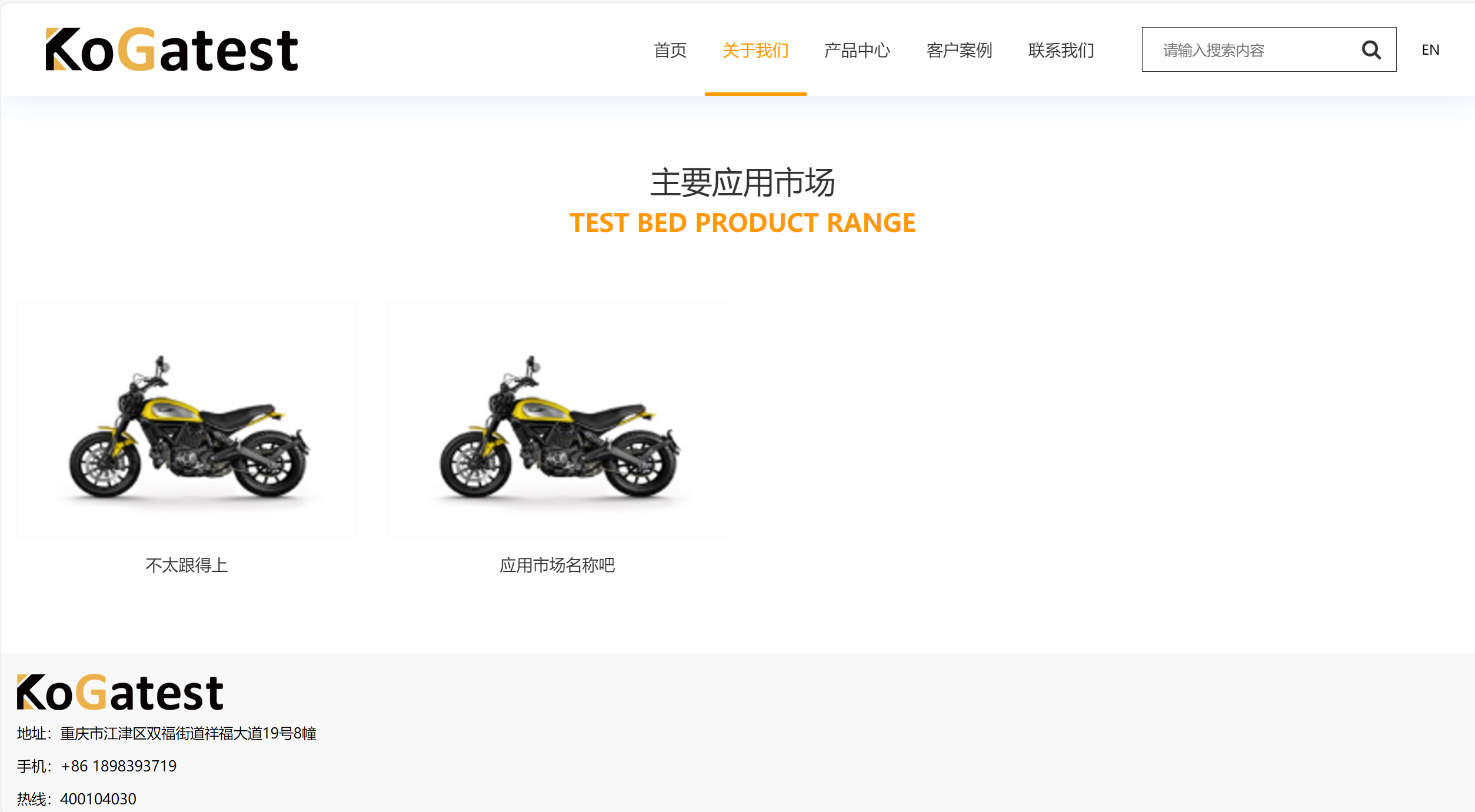 科嘉官网:一共分为首页、关于我们、产品中心、客户案例、联系我们这五个模块,其中首页:是对企业产品的介绍。关于我们:包含了公司简介、我的优势、主要应用市场、台架及相关产品范围主要是对企业自身的介绍和主要应用的市场介绍。产品中心:主要是围绕着企业的产品而分类的6个产品类型以及案例的介绍,包含底盘测功机台