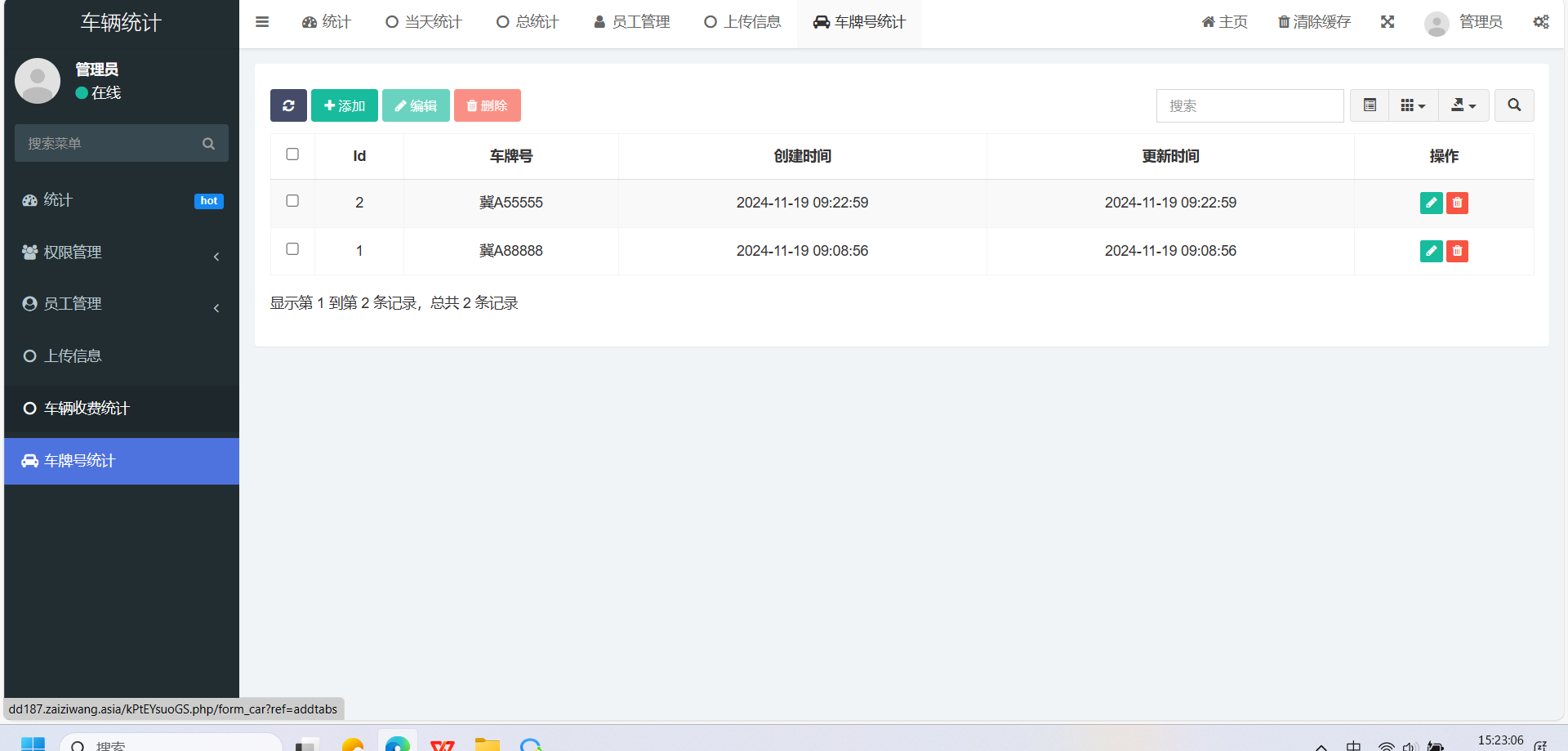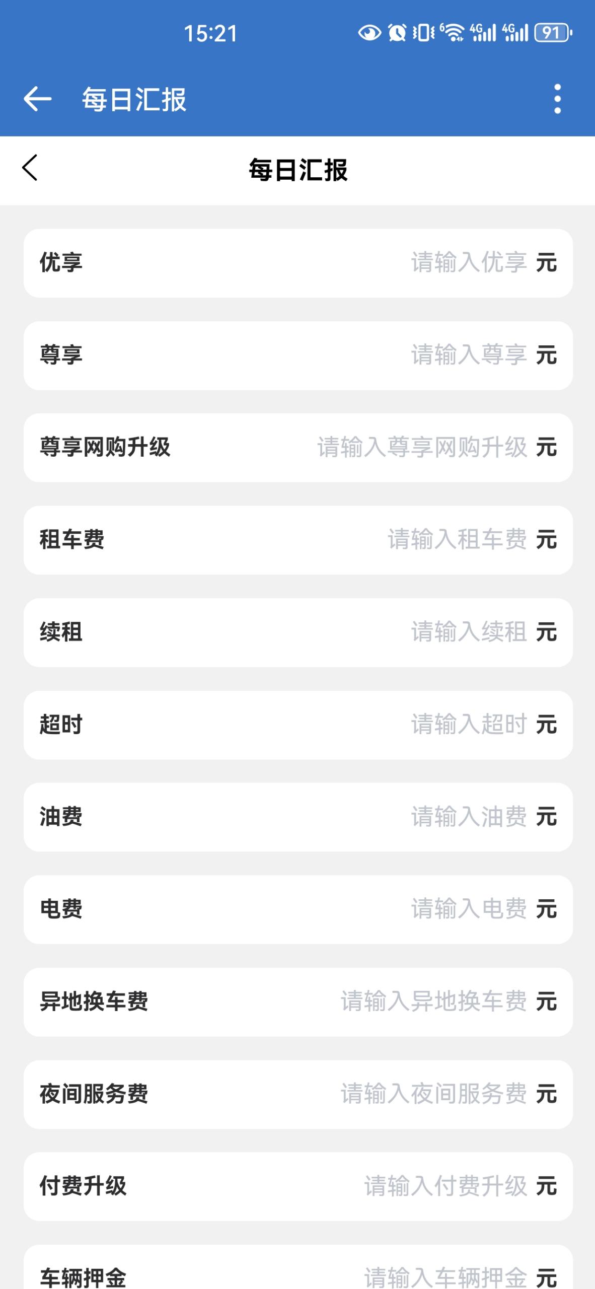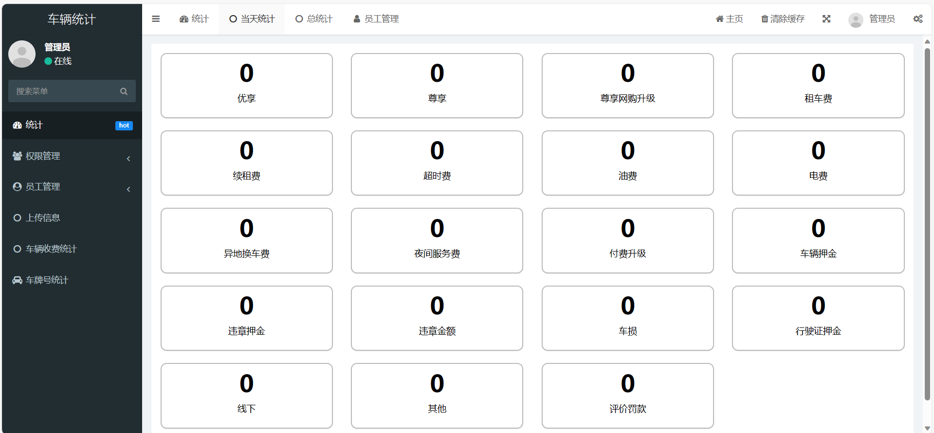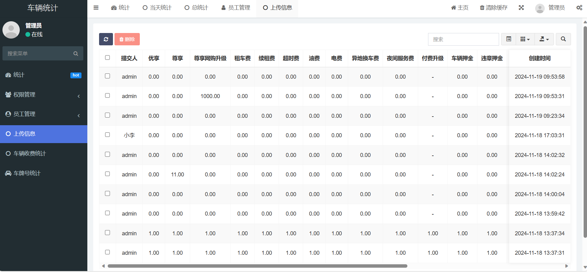 1. 每日汇报登录界面:用户需要输入账号和密码进行登录。汇报表单:用户可以输入各种车辆相关费用,包括违章金额、车损、行驶证押金、线下费用、其他费用、好评罚款、车牌号、提交人等信息。用户还可以上传提交凭证。2. 车辆统计侧边栏:包含多个管理选项,如统计、当天统计、总统计、员工管理、上传信息、车辆收费统