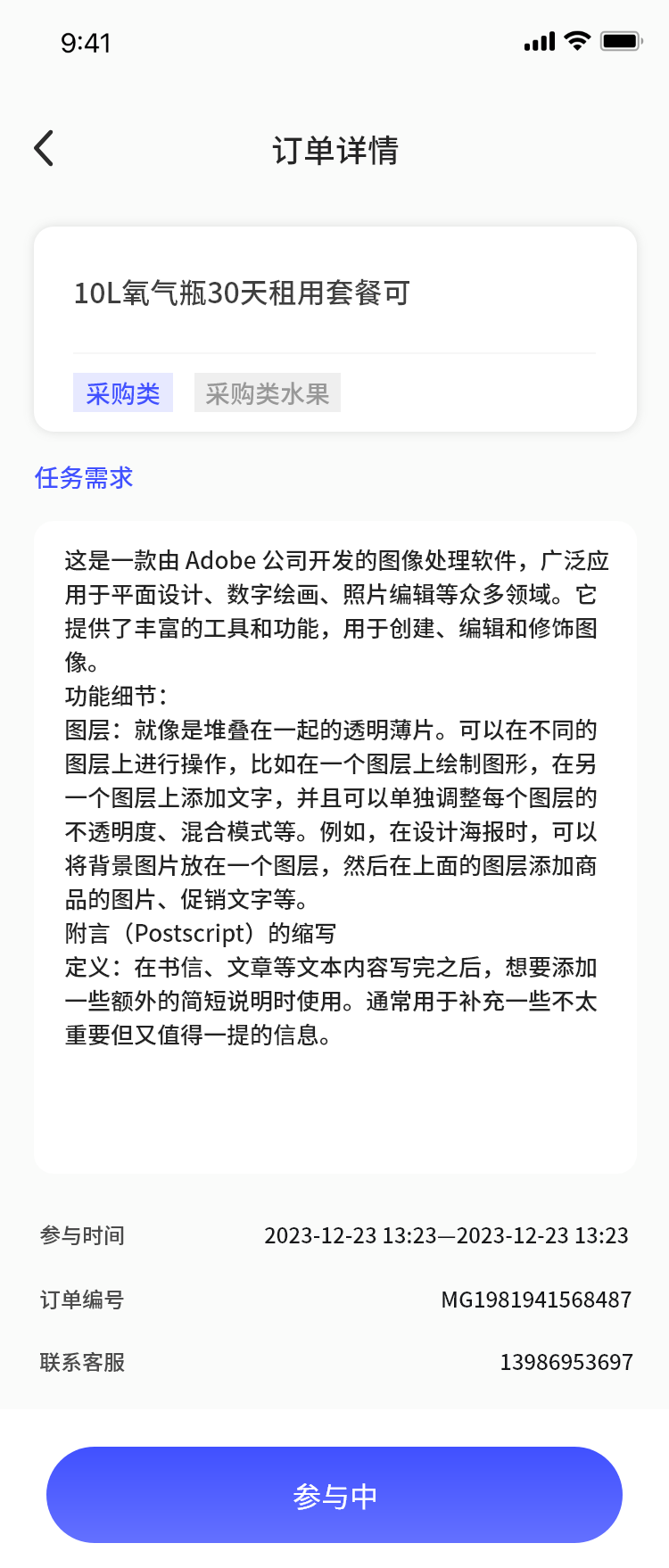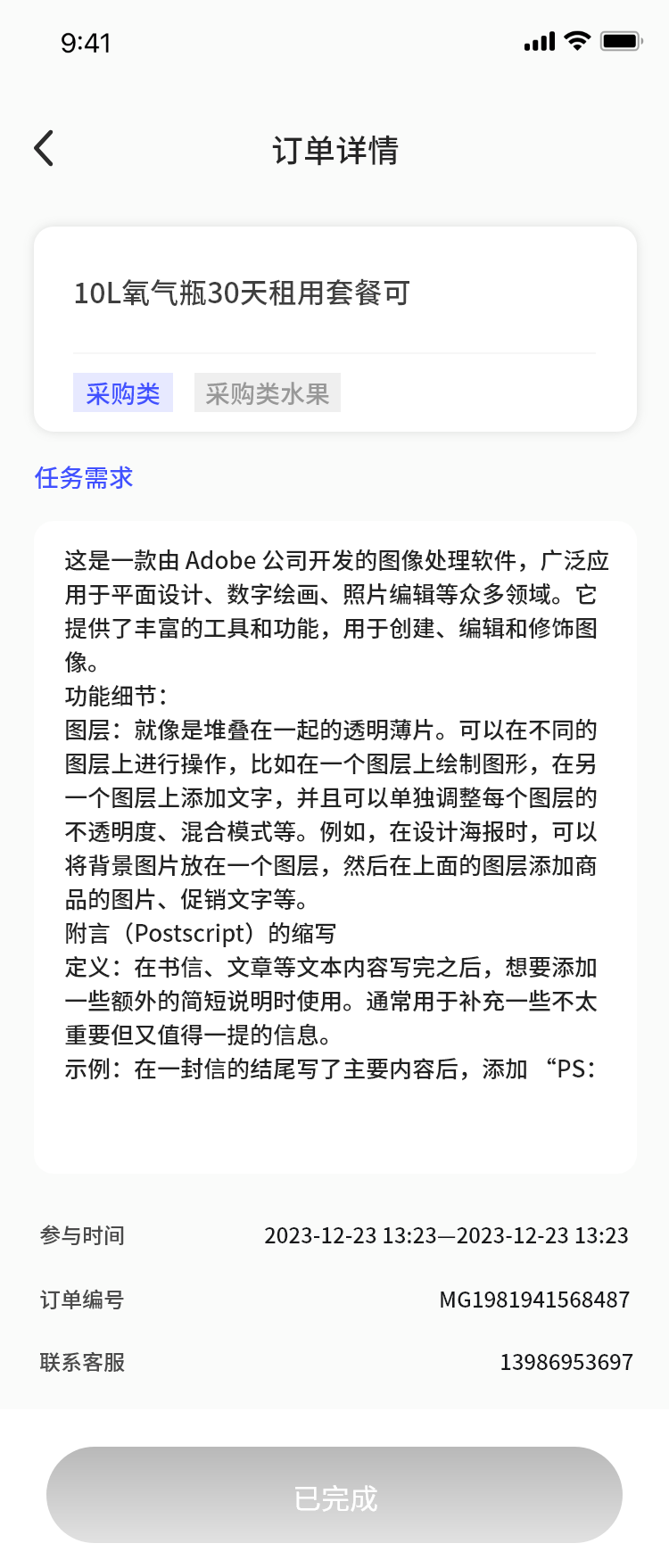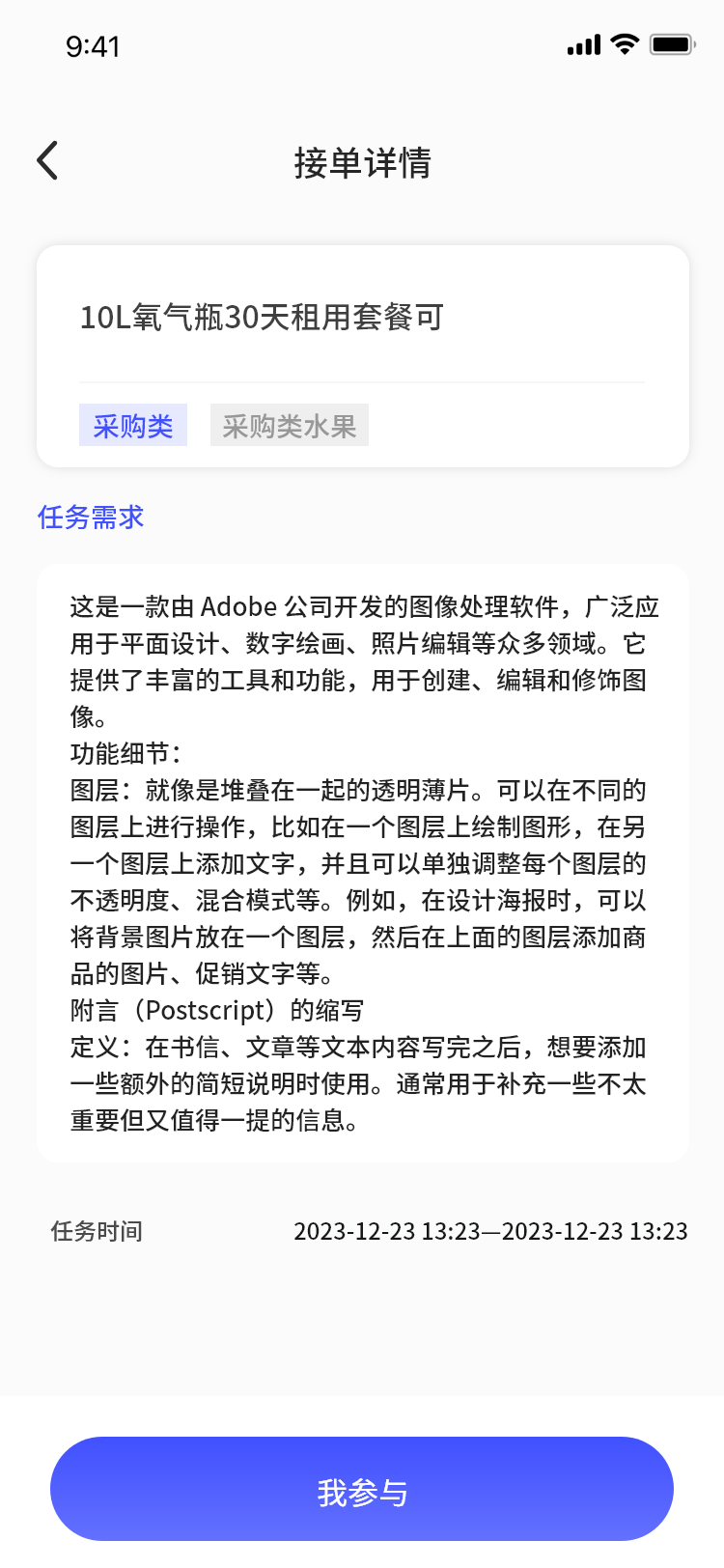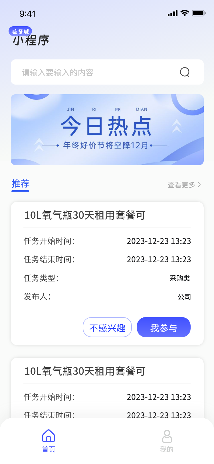 1. 首页界面今日热点:展示当前的热点信息,如 “年终好价节将空降 12 月”。推荐任务:显示推荐的任务,例如 “10L 氧气瓶 30 天租用套餐可”。每个任务显示任务开始时间、结束时间、任务类型和发布人。用户可以选择 “不感兴趣” 或 “我参与”。2. 登录界面知更鸟:应用程序的登录界面,用户需要