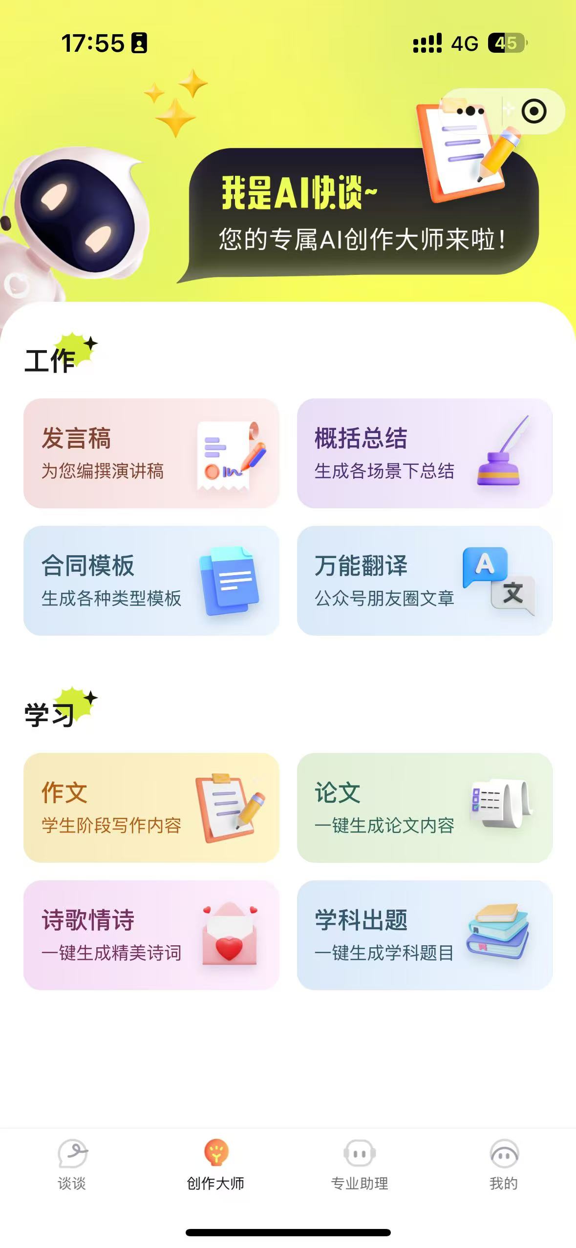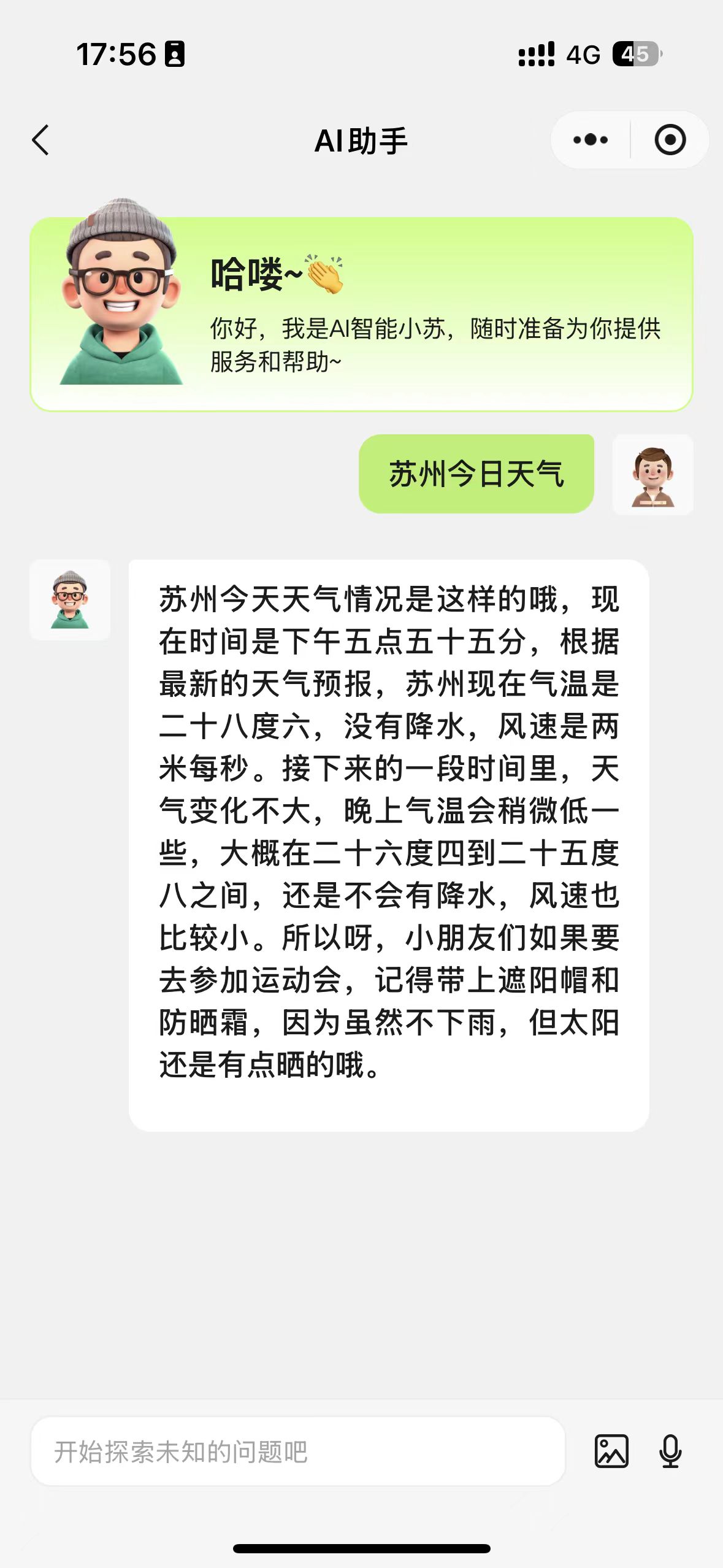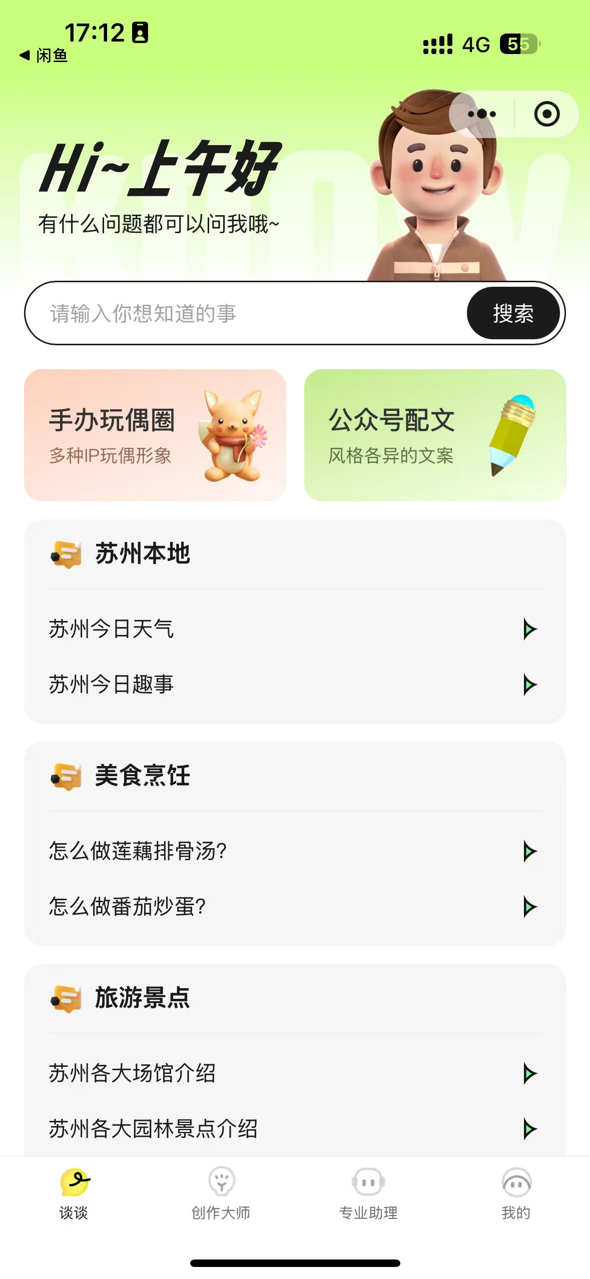 ai 智能助手 :针对苏州本地的旅游,天气,美食,这三个方面的一个AI智能工具。大家看到了,它包括 公众中号配文,和手办玩偶圈, 主要作为一个款苏州本地人使用的AI工具,这款智能工具基于文心一言大模型(python),配合PHP+mysql+uniapp,可以帮咱们准备发言稿,合同,翻译,写论文。等