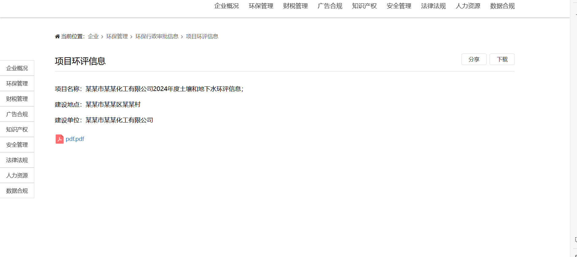 二、企业财税管理财务合规应收账款科目余额税务申报纳税申报检查税收政策财务管理财务风险管理方案企业预算管理方案内部控制体系建设特色企业咨询服务涉税涉费风险防控整改进度及完成情况财税风险提示风险整改方案行业政策标准财税文件管理四、企业环保管理环保行政审批信息项目环评信息其他政府部门批文环保验收信息验收报