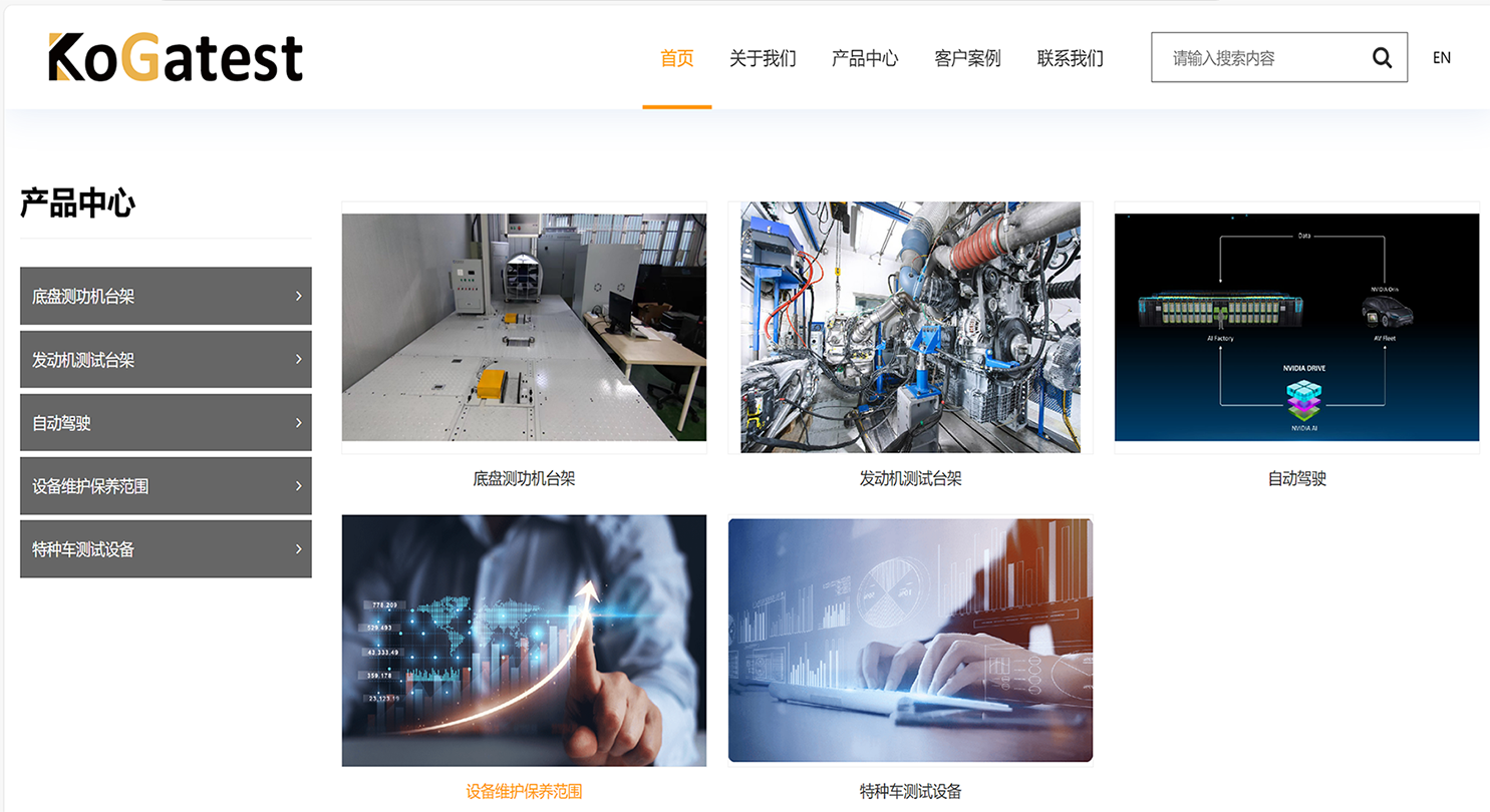 科嘉官网:一共分为首页、关于我们、产品中心、客户案例、联系我们这五个模块,其中首页:是对企业产品的介绍。关于我们:包含了公司简介、我的优势、主要应用市场、台架及相关产品范围主要是对企业自身的介绍和主要应用的市场介绍。产品中心:主要是围绕着企业的产品而分类的6个产品类型以及案例的介绍,包含底盘测功机台