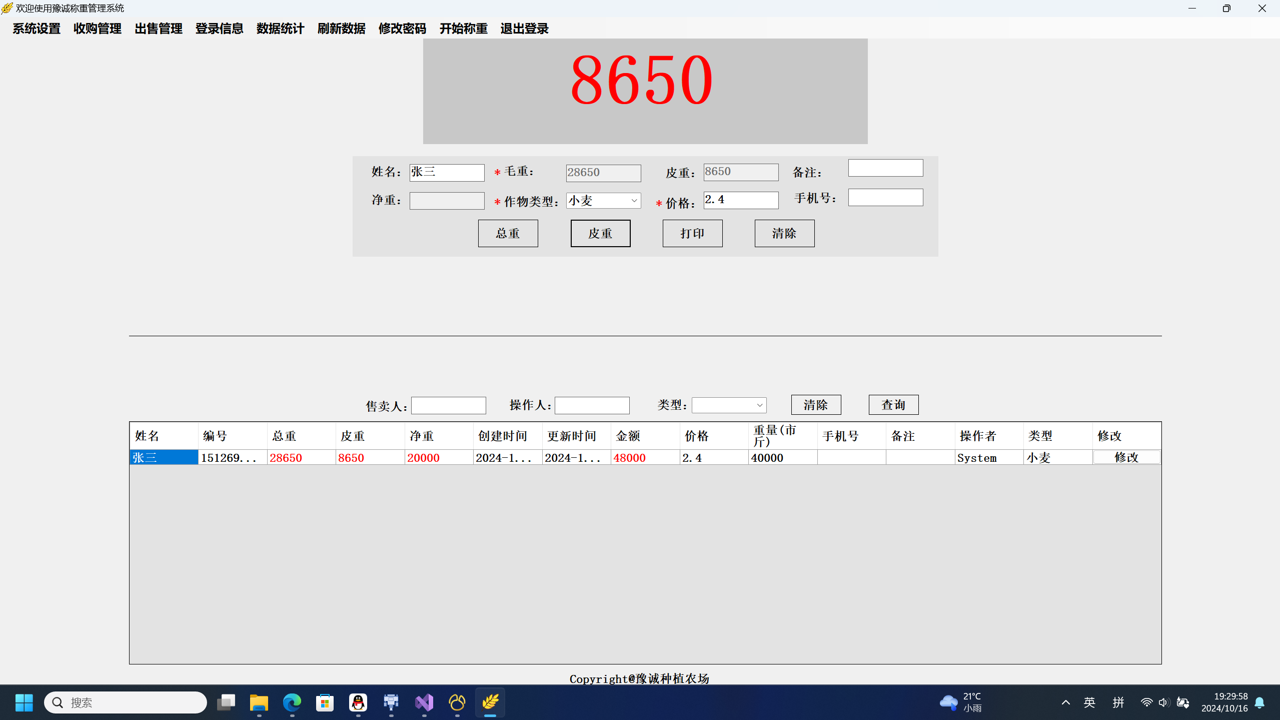 豫诚称重系统最初是为粮食收购的商户进行称重记账系统开发的,可以连接地磅和小票打印机进行电脑称重、记账、打印小票等功能,可有效帮助各类收购/出售类的小商家完成记账业务。目前在线下粮食收购点稳定运行。使用此软件则代表您认可此软件,尊重此软件的知识产权和开发者的劳动成果