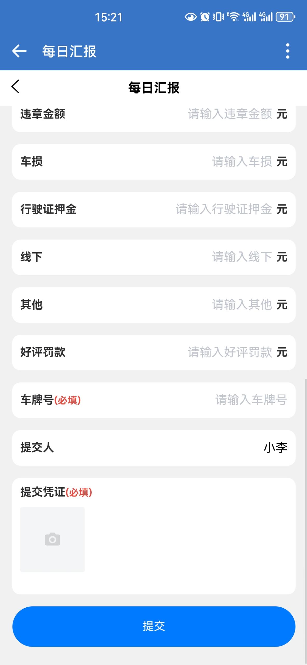 1. 每日汇报登录界面:用户需要输入账号和密码进行登录。汇报表单:用户可以输入各种车辆相关费用,包括违章金额、车损、行驶证押金、线下费用、其他费用、好评罚款、车牌号、提交人等信息。用户还可以上传提交凭证。2. 车辆统计侧边栏:包含多个管理选项,如统计、当天统计、总统计、员工管理、上传信息、车辆收费统