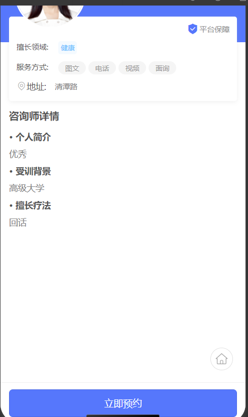 用户在线预约咨询师 购买服务,可以图文咨询,视频咨询,电话自信 ,线下咨询心理咨询预约:包括心理咨询师,健康咨询师,情感咨询师,。通过小程序可以直接预约,选择预约时间段,然后能看到咨询师的详情页以及电话,这个是很典型的 基础预约小程序,可以基于这个基础上二开定制化的功能。