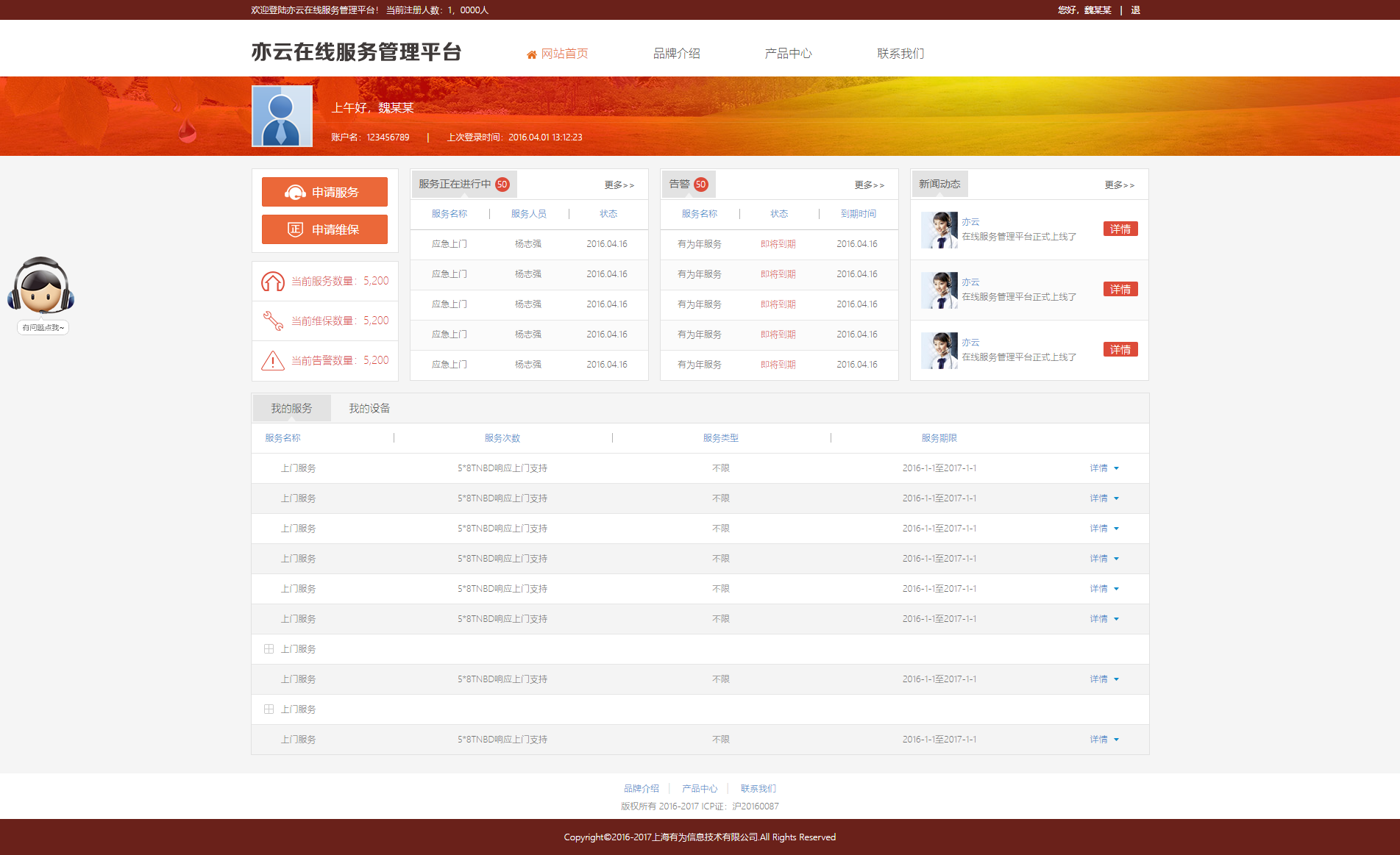 亦云在线服务管理平台是一款服务平台管理系统,统计了服务和设备的相关信息,并有品牌介绍和产品介绍
