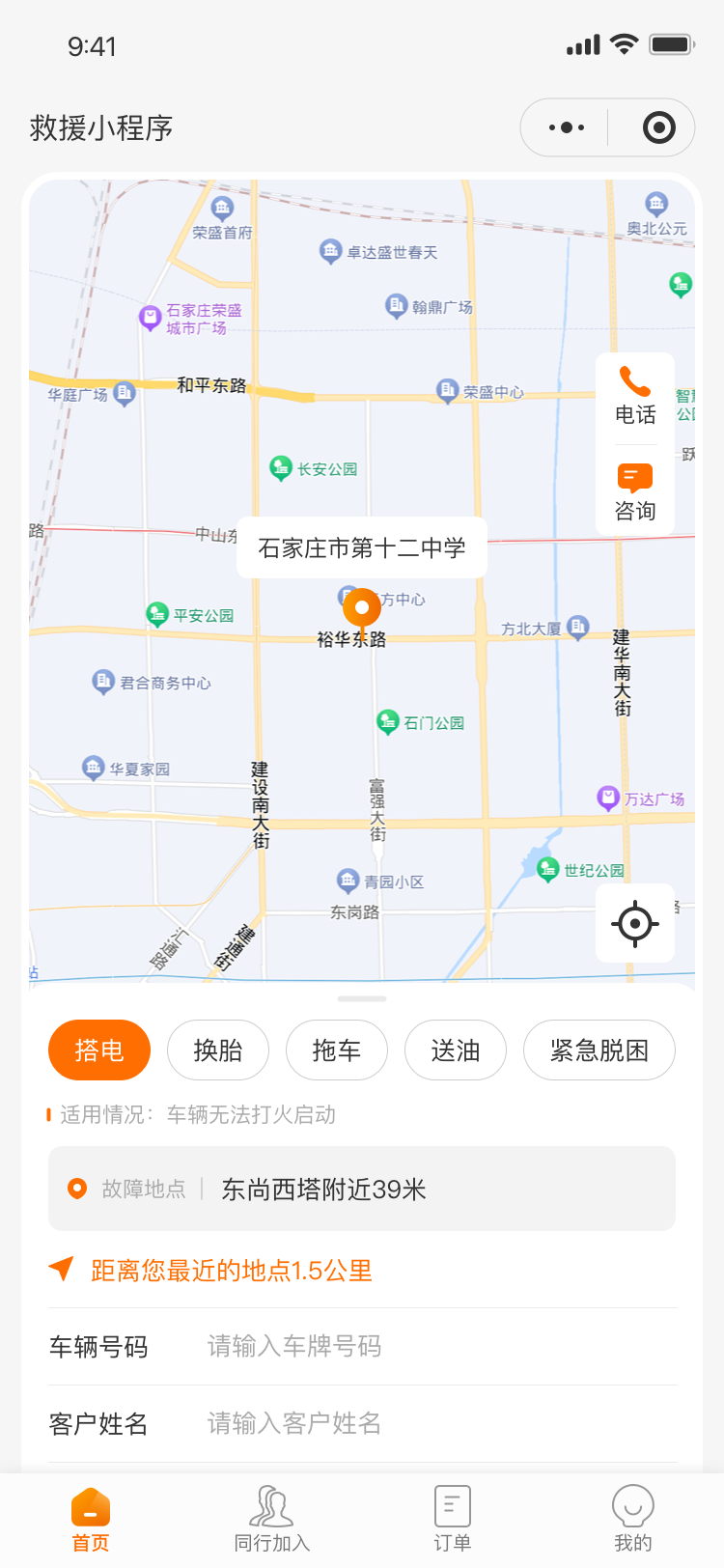 搭电:定位,车牌号码,客户姓名,联系方式,现场拍照,预约时间,预计费用换胎:定位,车牌号码,客户姓名,联系方式,现场拍照,预约时间,预计费用拖车:定位,车牌号码,客户姓名,联系方式,现场拍照,预约时间,车在车库,使用辅轮,预计费用送油:定位,车牌号码,客户姓名,联系方式,现场拍照,预约时间,预计费用