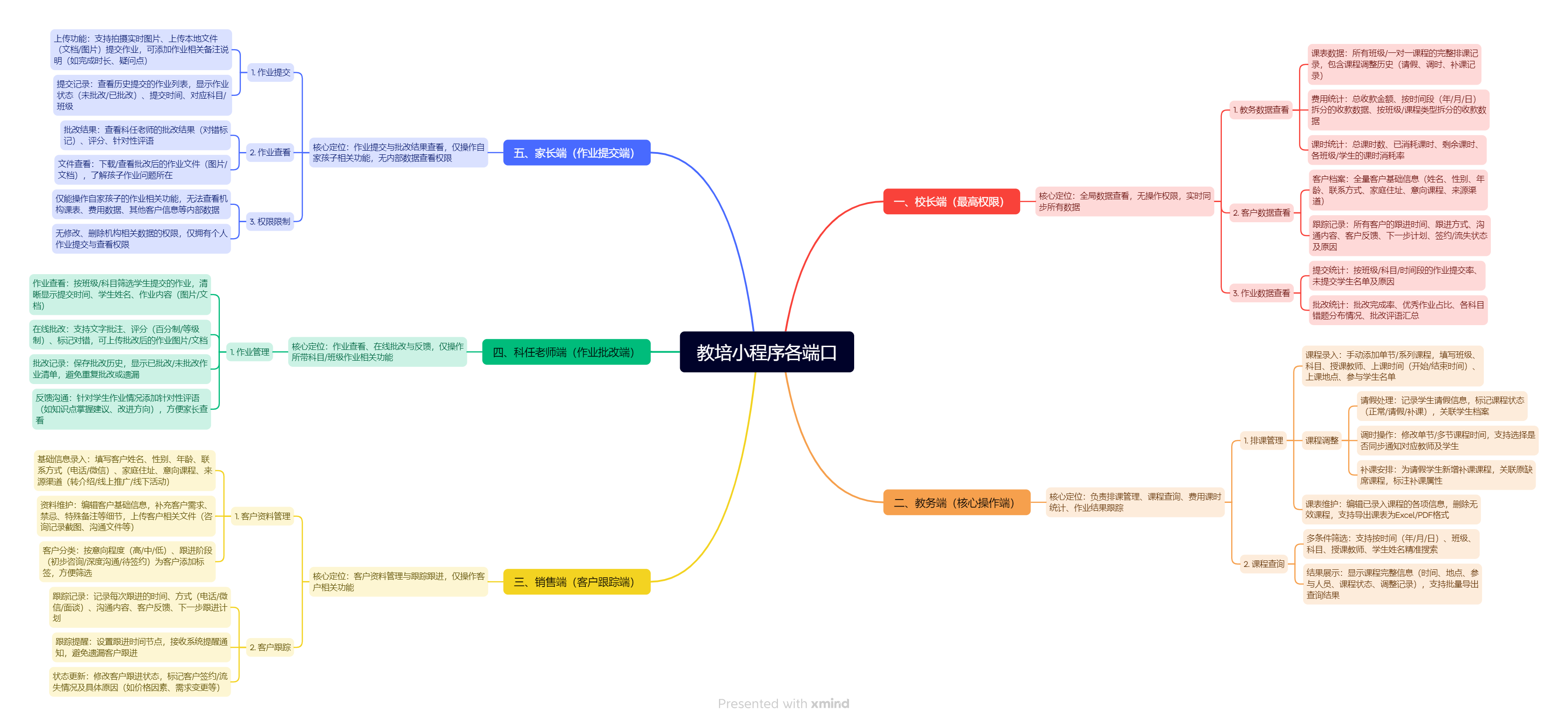 为教培机构搭建多角色(校长、教务、销售等)协同的小程序,实现作业、排课、客户、数据等全流程数字化管理,解决各岗位工作分散、效率低的痛点,同时满足机构精细化运营与家校联动的需求。