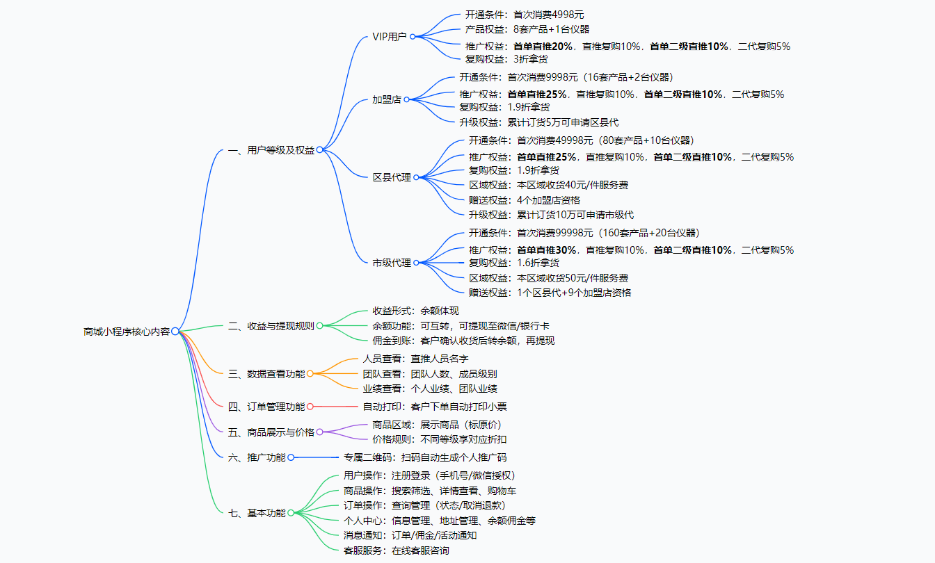 亮点:设计 VIP / 加盟店等多层级用户权益体系,整合收益提现、数据查看、订单管理等全链路功能,支持分级推广与折扣规则。解决的问题:解决了用户分层运营缺失、推广激励不清晰、收益结算低效、交易与数据管理分散的问题。